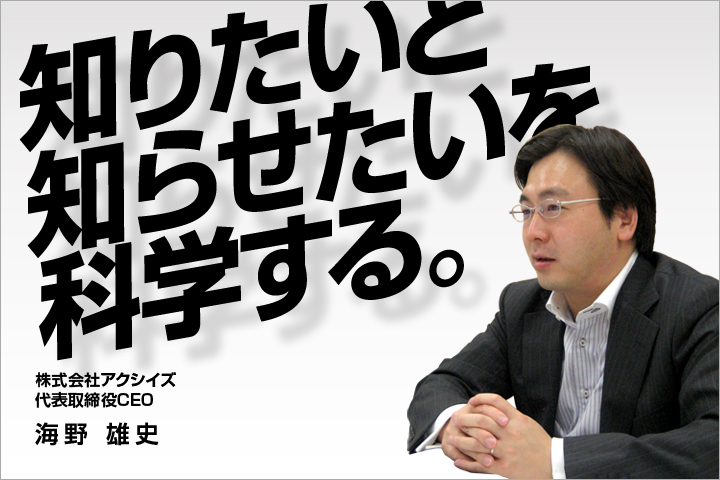 | 株式会社アクシイズ。設立4年目、インターネット業界の新しいマーケットであるLPO事業のシェアトップの企業である。LPOとはLanding Page Optimizationの略で、Webサイトに訪れた人の属性に応じて、表示する内容を変える技術の事である。代表の海野雄史氏に、事業の立ち上げから個人の夢まで伺った。彼はいったいどのような夢の実現を現在の事業に託しているのだろうか? |