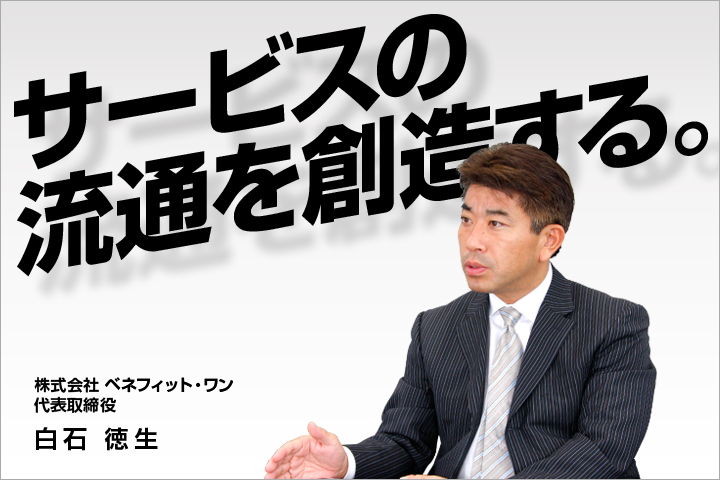 白石:元々、インターネットのビジネスをやろうと先に決めていました。当時からインターネットを使ったビジネスというのはeコマースかサービスマッチング型のぐるなび、あとはヤフーかみたいなビジネスモデルだと言われていました。時代に逆行していると思われるかもしれませんが、ヤフーやグーグルのようなビジネスモデルは長続きしないと思っています。広告収入型というのは、広告には必ずバイアスがかかりますから、正しい情報に成り得る訳がないんですね。消去法でいったらeコマースで、どうせやるならサービスマッチングだと分野を決めたわけです。なぜなら、サービスというのはインターネットだろうがリアルだろうが流通がないわけですから、信用性も高いじゃないですか。物流の必要もないわけですし。サービスマッチングをやろう、サービスの流通創造につなげよう。そして対外的な表現方法を「福利厚生のアウトソーシング」としました。