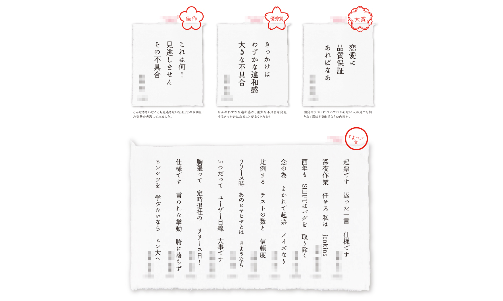 SHIFTはソフトウェアの品質保証・テストのプロ集団。そこで働くSHIFTの全スタッフから、日々の業務のなかで、「品質について」「お客様の開発 について」思うことを徒然なるままに詠った川柳「品質あるある川柳」を公募しました。